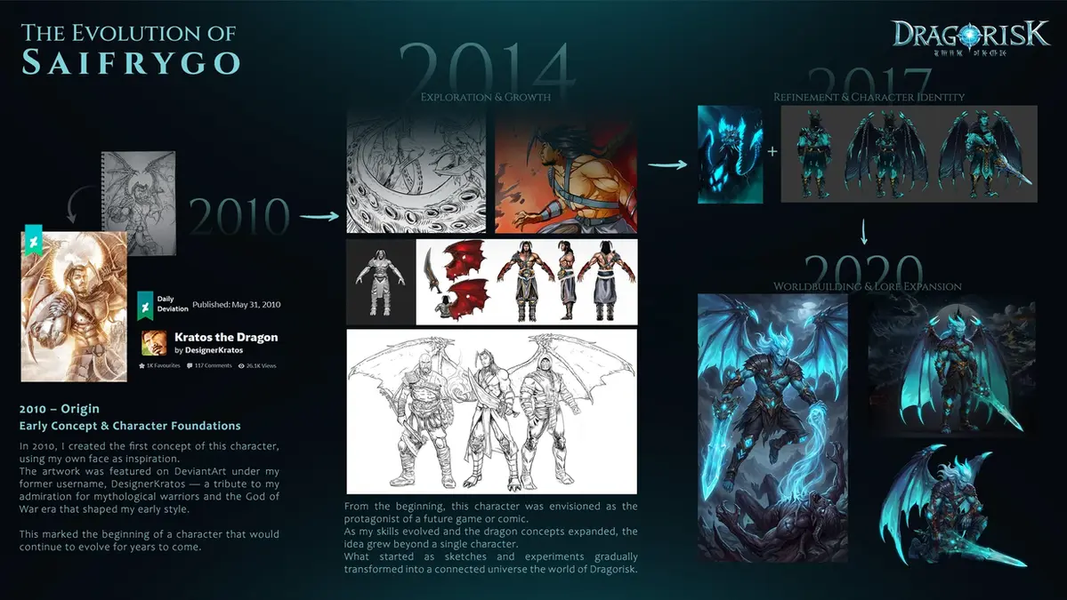 Dragorisk is a definitive dark fantasy universe composed of fractured realms, ancient dragons, and forgotten magic. This project documents over 15 years of authentic evolution, originating in 2010 as a single character concept by Saifrygo. Since its inception, it has matured from initial sketches of mythological warriors into a complex, multi-dimensional Intellectual Property (IP).